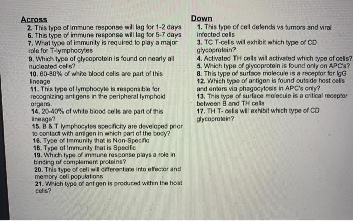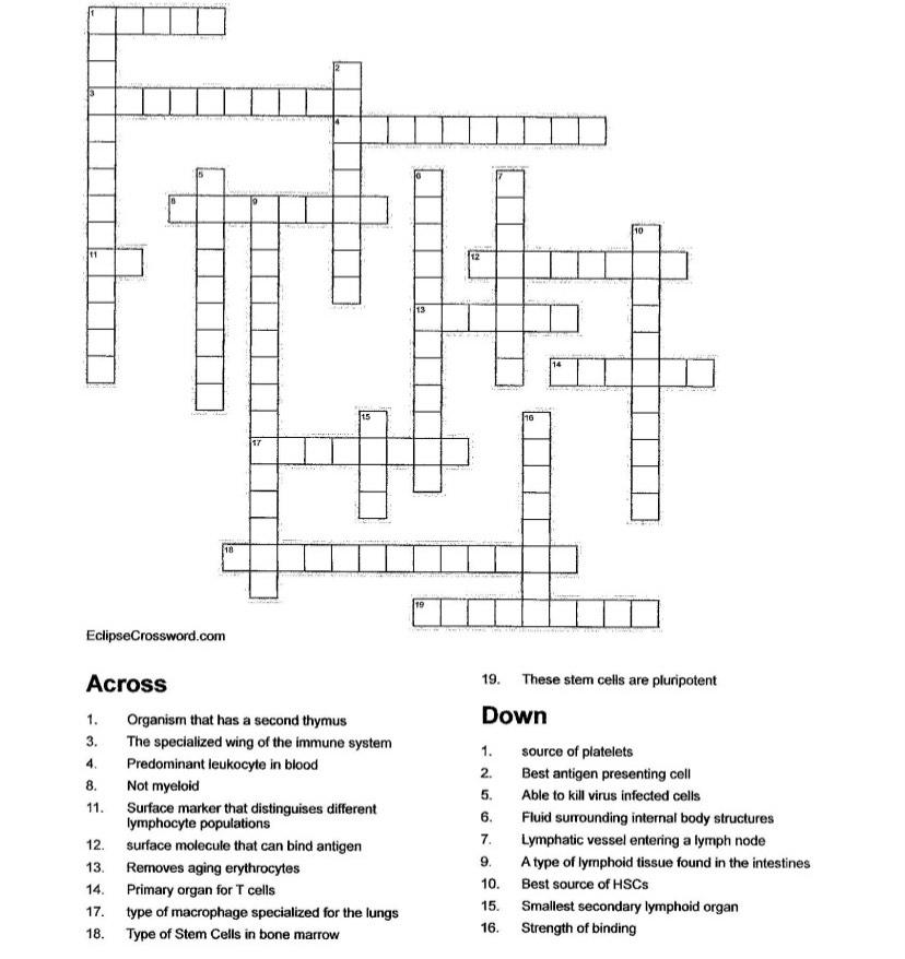 The word that solves this crossword puzzle is 5 letters long and begins with T. Immune system lymphocyte is a crossword puzzle clue that we have spotted 7 times. There are related clues shown below. 6 August 2017 Go to Crossword Type of lymphocyte which is important in the immune system. Best Answer for Immune System Lymphocyte Crossword Clue. Enter the answer length or the answer pattern to get better results. Click the answer to find similar crossword clues. The Crossword Solver found 20 answers to the immune system lymphocyte2645 crossword clue. There are related clues shown below.