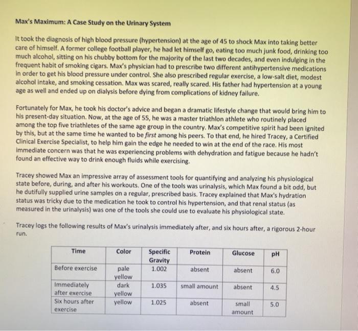 This is called the transport maximum Tm for glucose. A former college football player he had let himself go eating too much junk food drinking too much alcohol sitting on his chubby bottom for the majority of the last two decades. A Case Study on the Urinary System It took the diagnosis of high blood pressure hypertension at the age of 45 to shock Max into taking better care of himself.