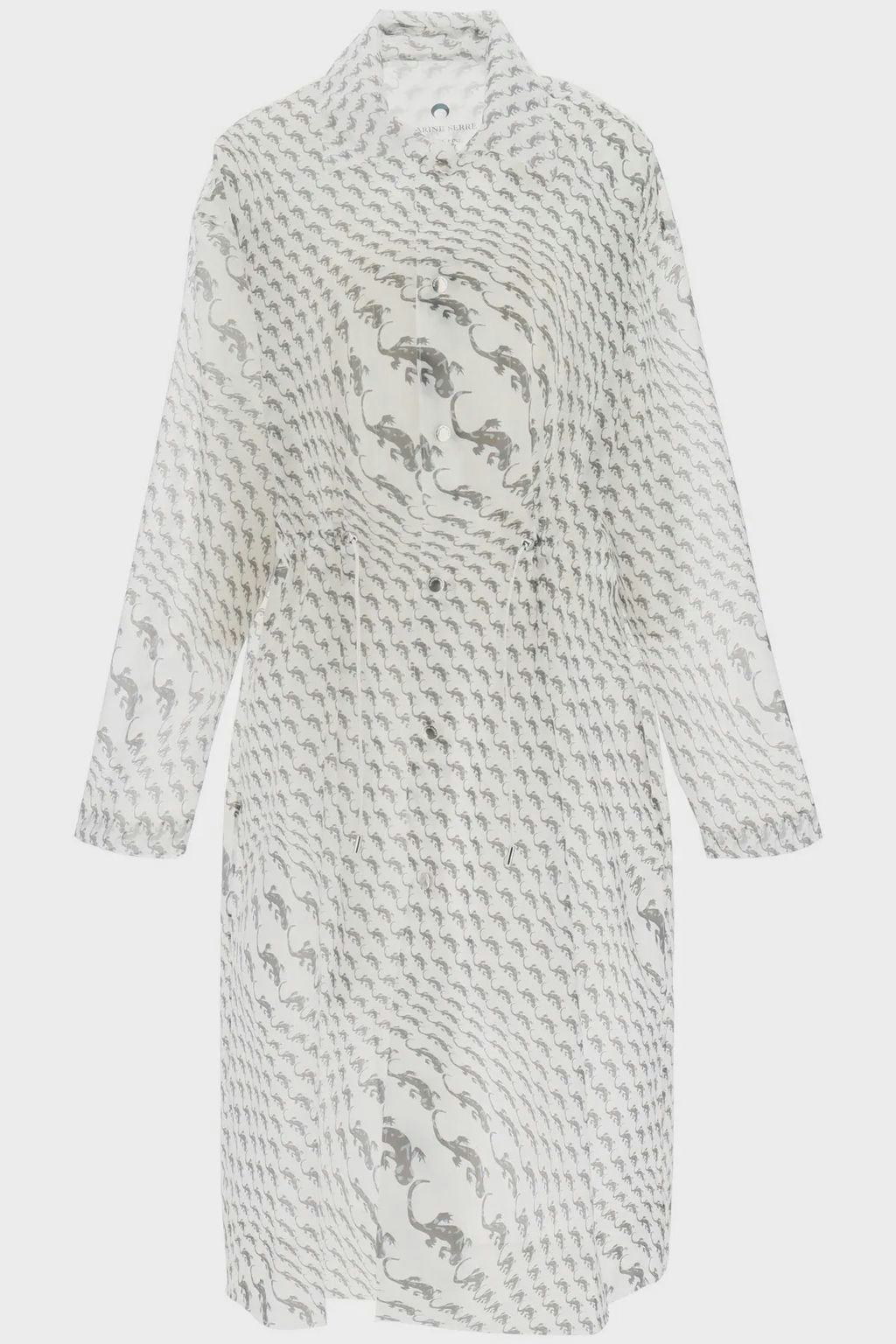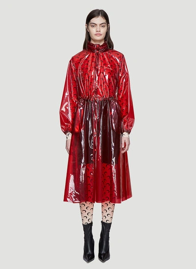 The oversized silhouette features a classic pointed collar a front closure with snap buttons side slit pockets and a drawstring waist. MIDI MARINE GREENHOUSE raincoat made of semi-transparent PVC characterised by a contrasting salamander print on the entire surface. Marine Serre Red PVC Raincoat by Marine Serre.